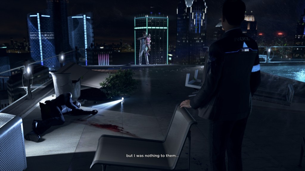 La storia viene raccontata attraverso le vicende che coinvolgono tre androidi: Connor, Kara e Marcus. Si inizia con Connor, ultimo modello di androide prodotto dall’azienda Cyberlife, progettato per indagare il problema dei “devianti”, ovvero androidi che non rispondono più correttamente agli “ordini” imposti ed escono dai binari previsti dalla loro programmazione. Questa prima missione parte col botto: in una finestra temporale molto ristretta Connor deve raccogliere le informazione sparse nell’abitazione di una famiglia proprietaria di un deviante e sfruttarle per gestire l’androide in preda al panico che si ritrova per la prima volota nella situazione di non sapere cosa fare, mentre tiene in ostaggio una bambina con una pistola sul tetto di un edificio altissimo, mentre attorno a loro svolazza un elicottero della polizia. Il tempo per agire è ristretto e le decisioni non sono facili da prendere. Un inizio incredibile scandito da un ritmo serrato che fa capire subito al giocatore la struttura di base e la potenza emotiva del titolo.